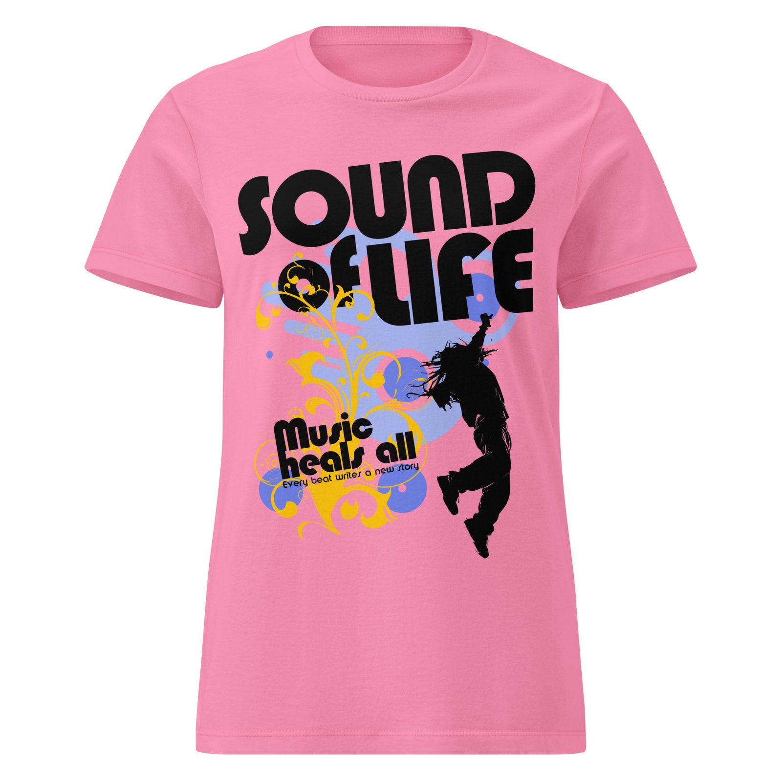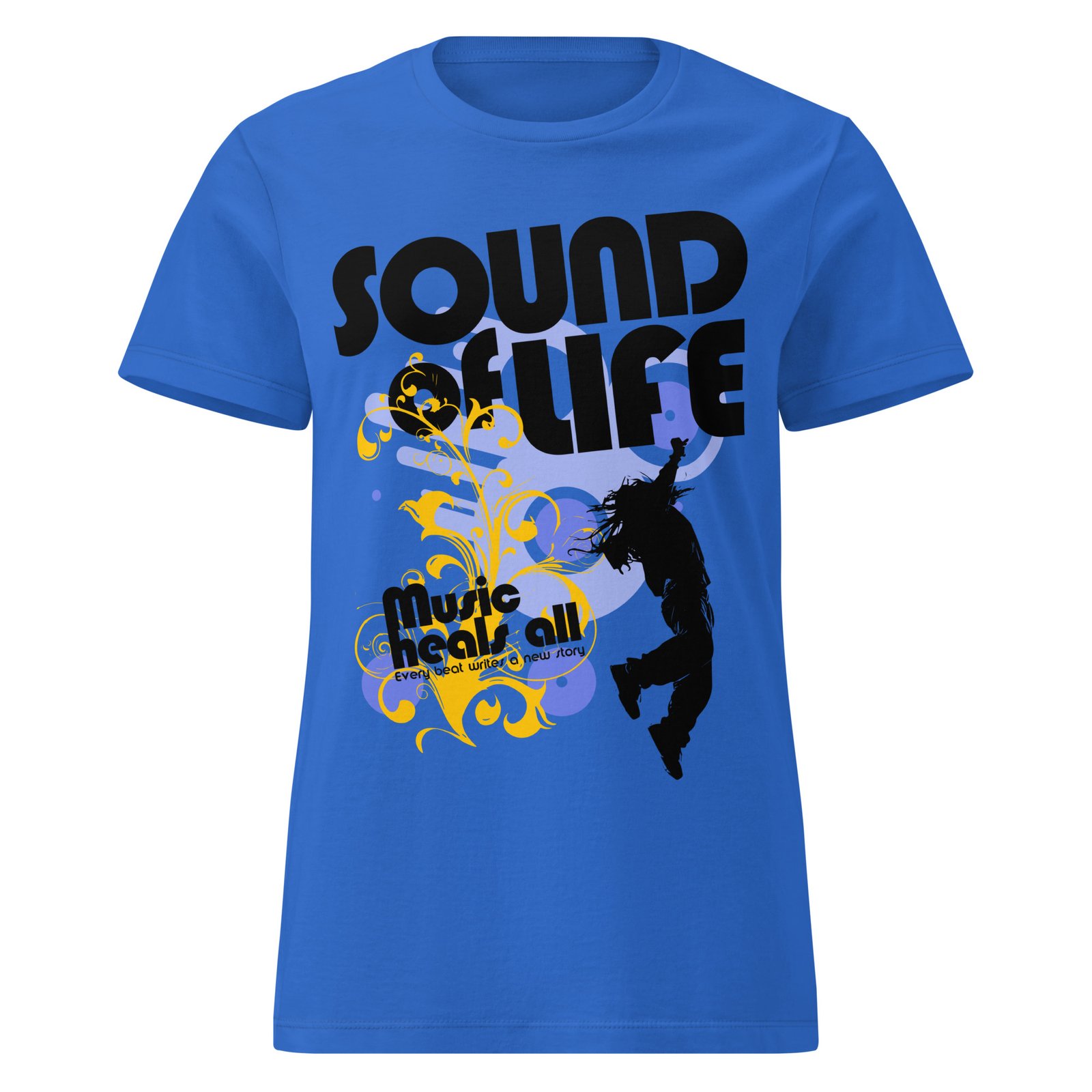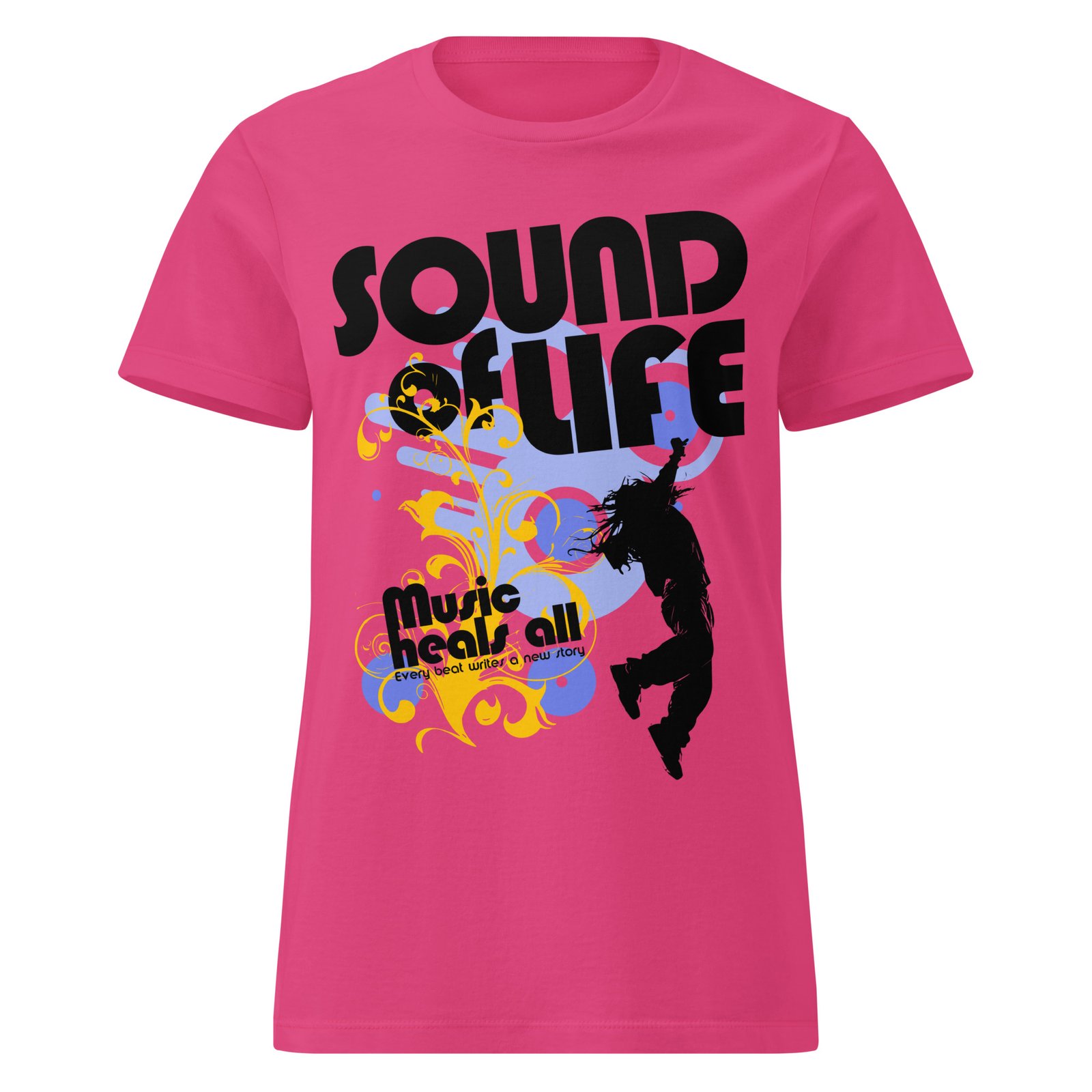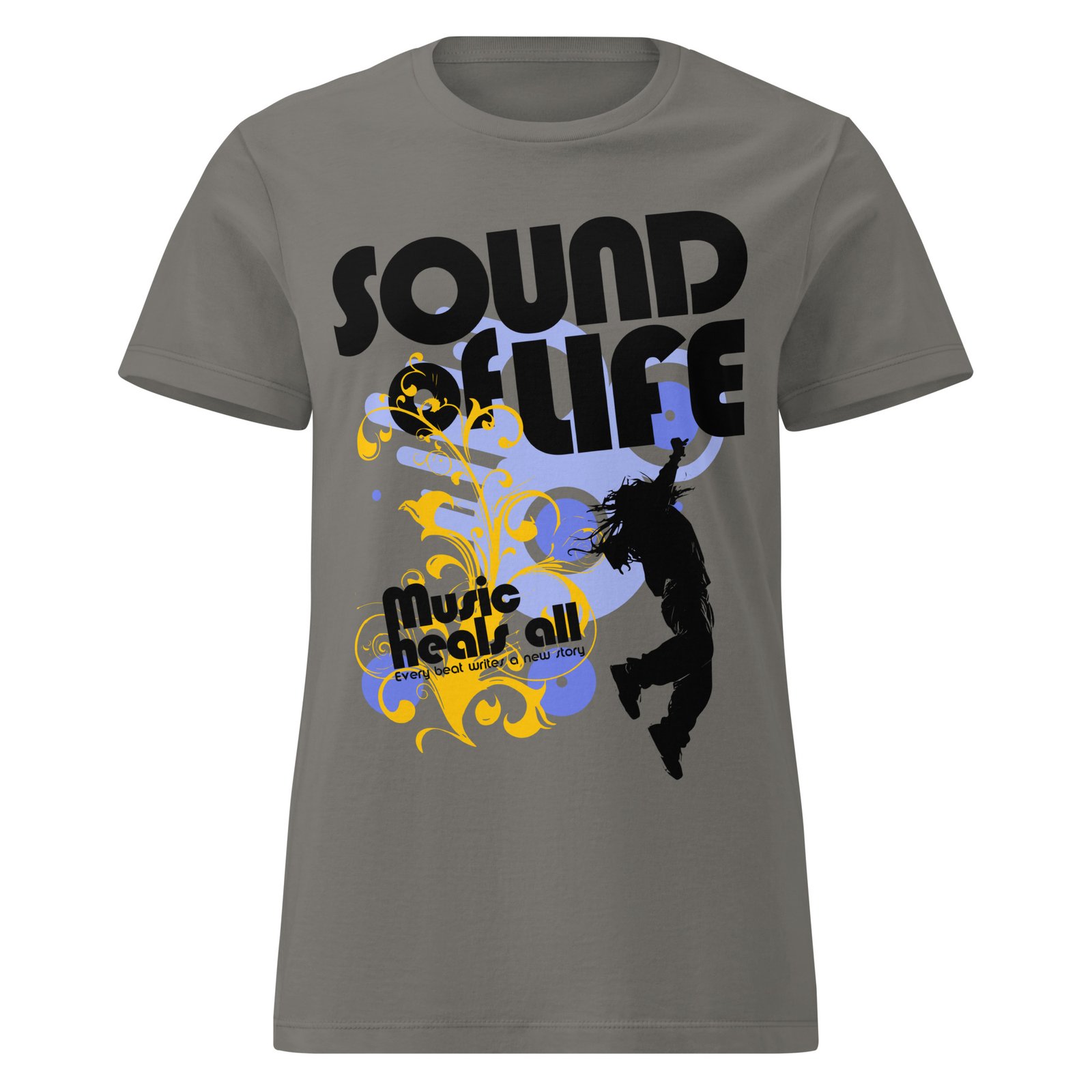 Bold graffiti-style print with “Sound of Life” text. Jumping female silhouette for a dynamic look. This Frutiger Metro women’s shirt captures Y2K energy.
