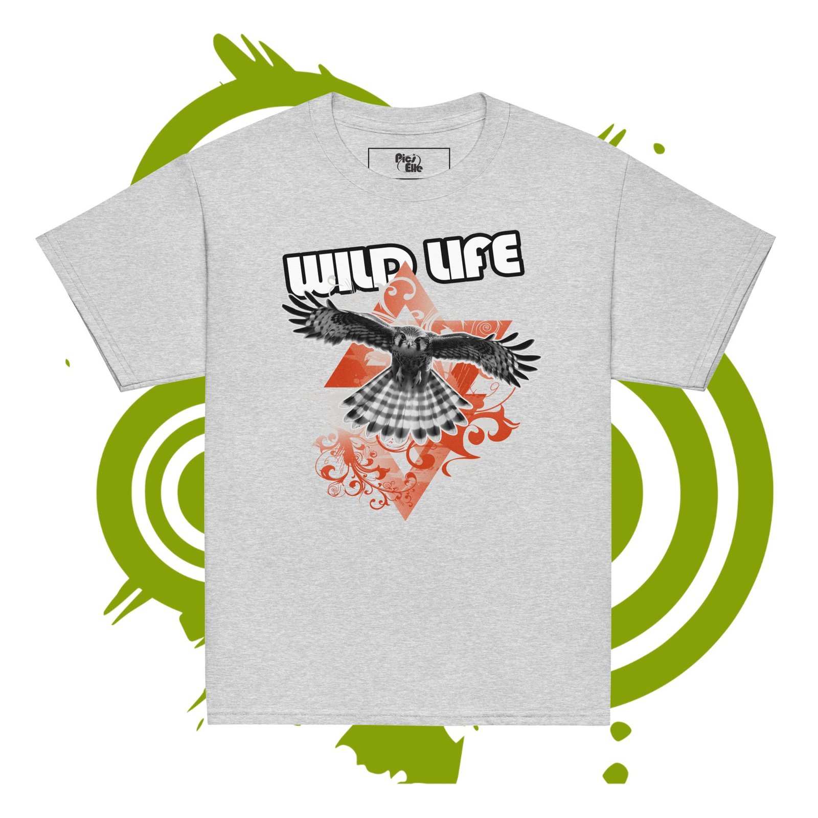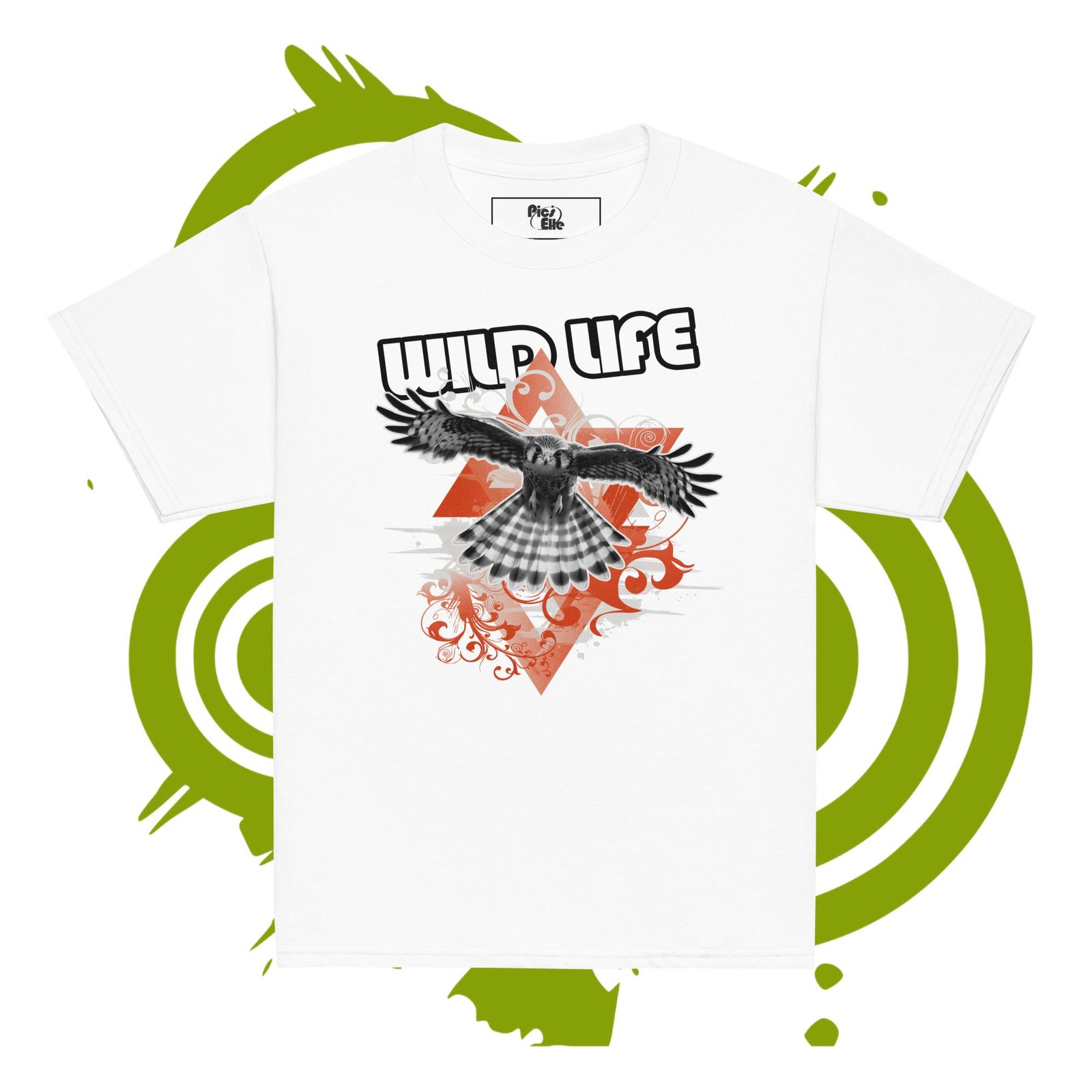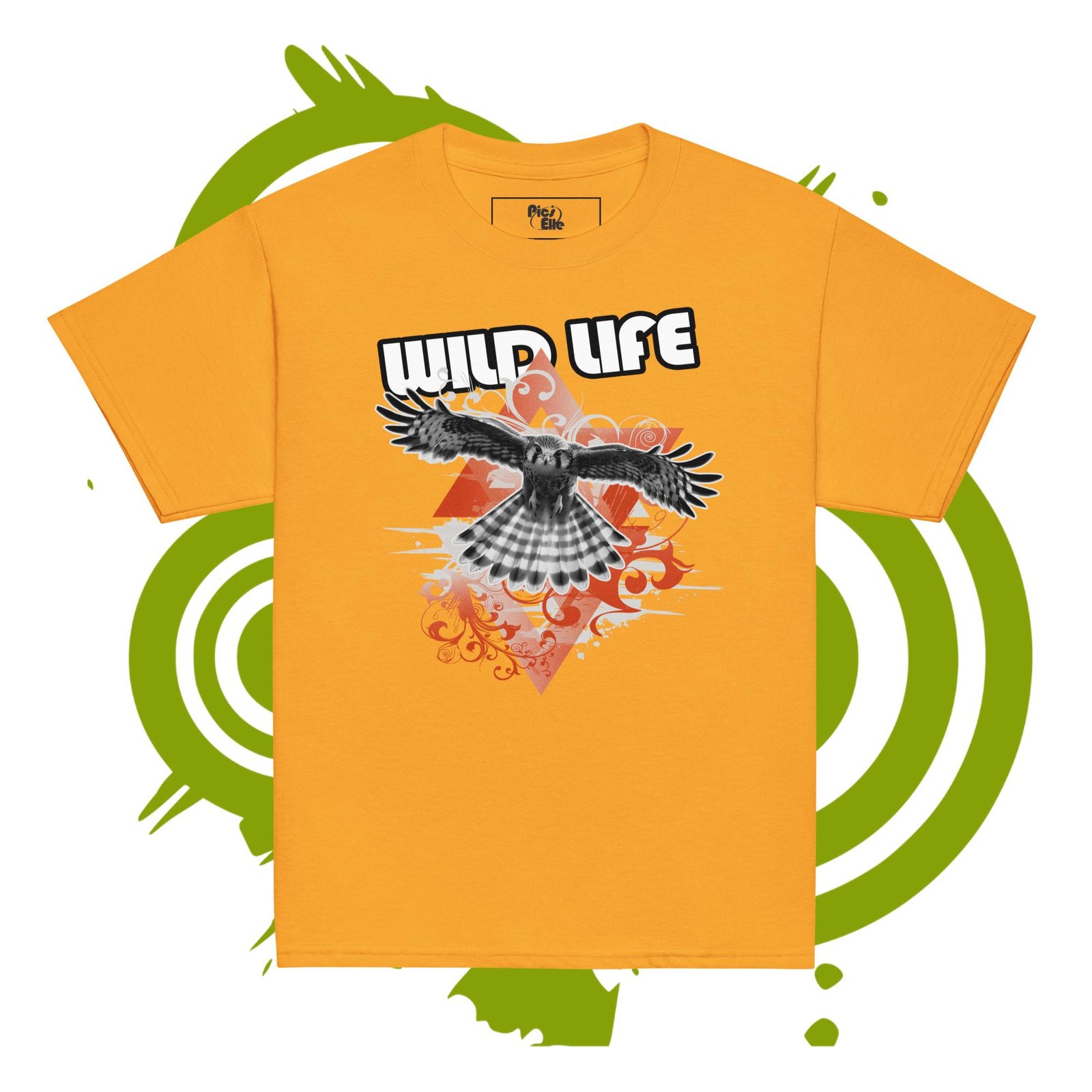 The Youth classic tee – Wild Life falcon – orange geometric graffiti blends wildlife inspiration with a bold streetwear edge. Featuring a falcon graphic over an abstract orange graffiti background with vector garden ornaments, this wild life falcon t-shirt stands out with style.