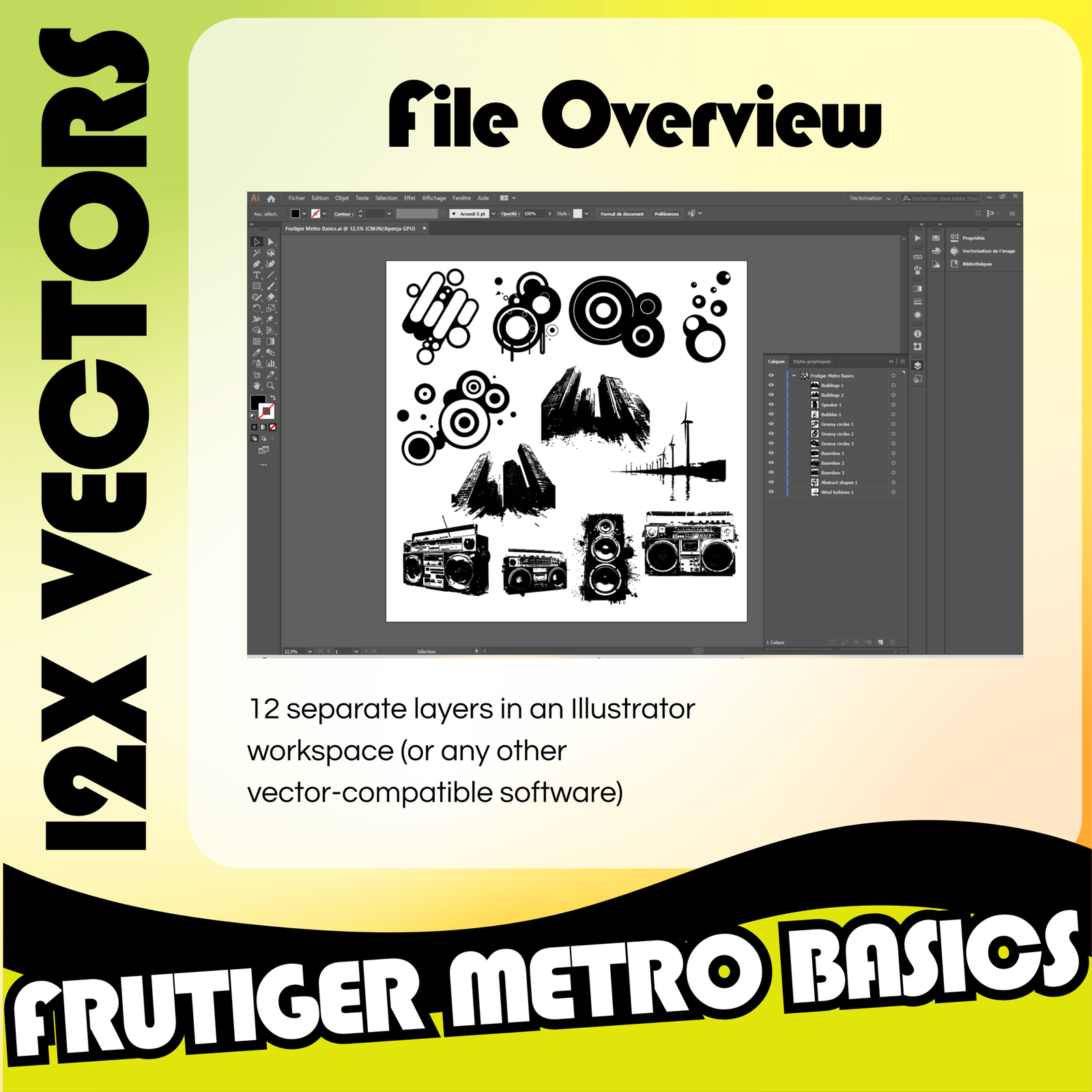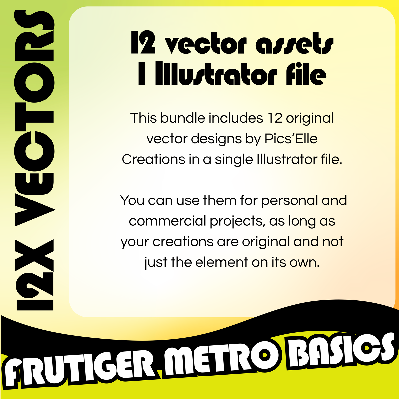 Elevate your creative projects with the Frutiger Metro Basics – 12x Vector Pack. Inspired by modern urban aesthetics and retro graphic trends, this collection delivers a unique set of ready-to-use visual elements.