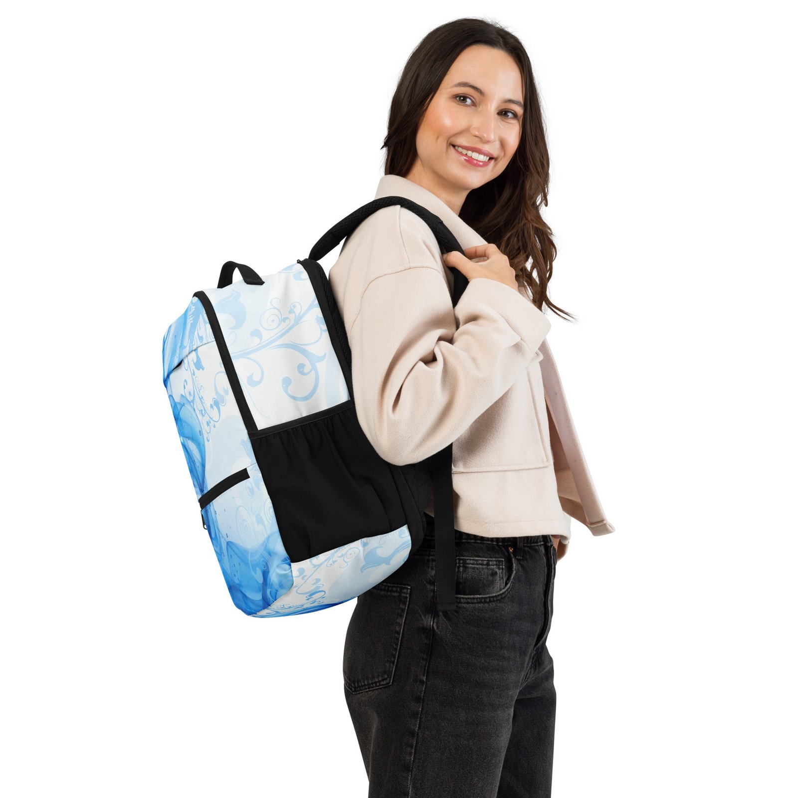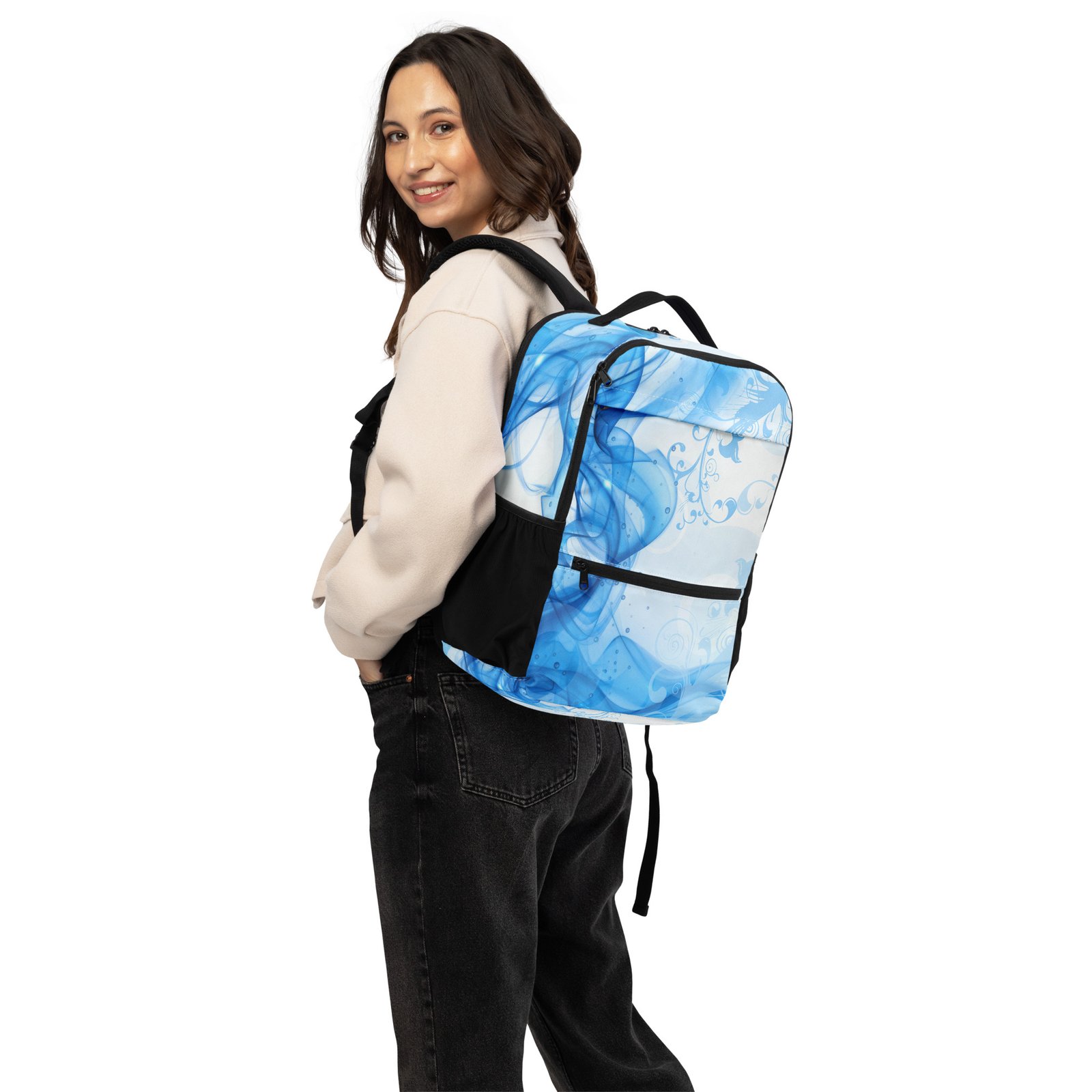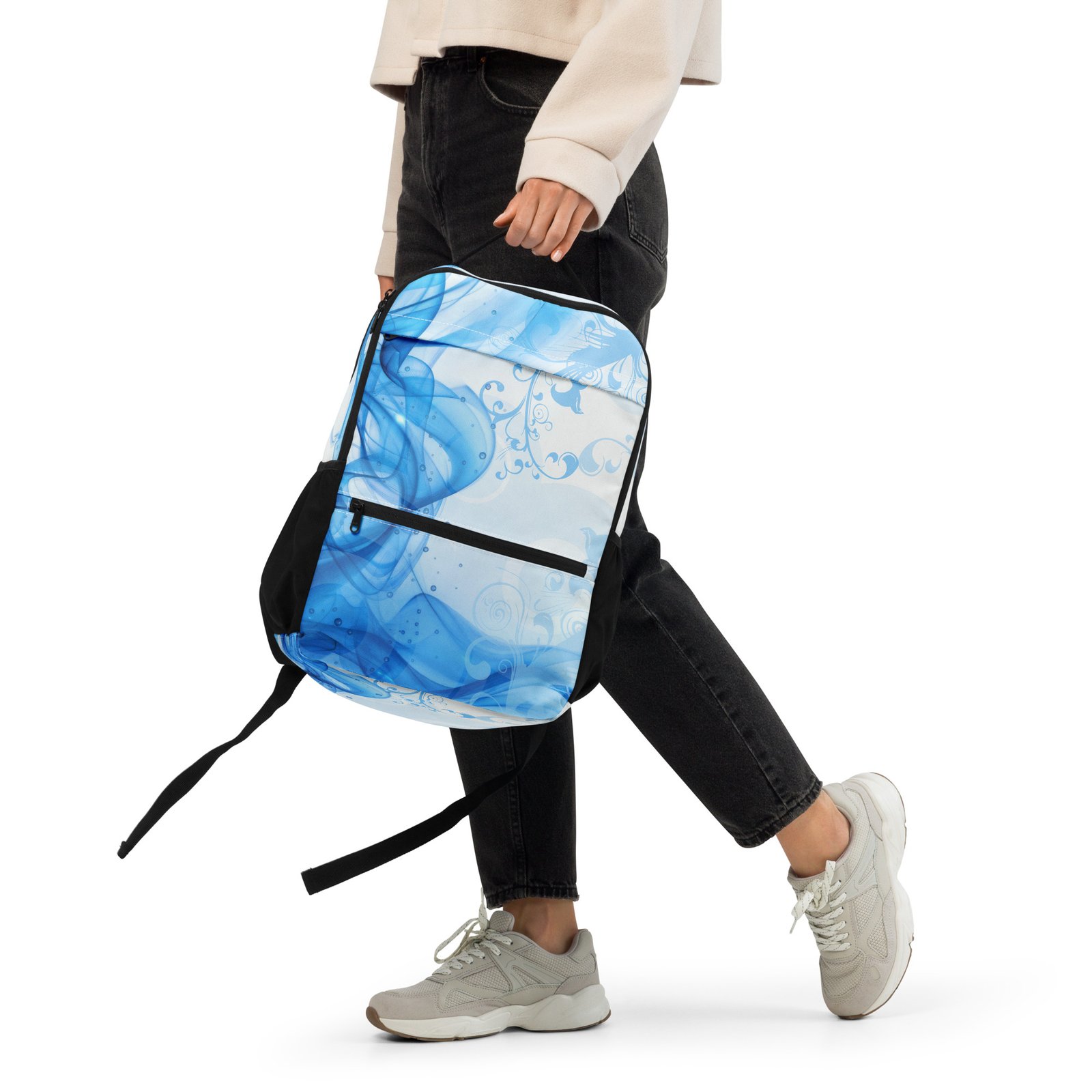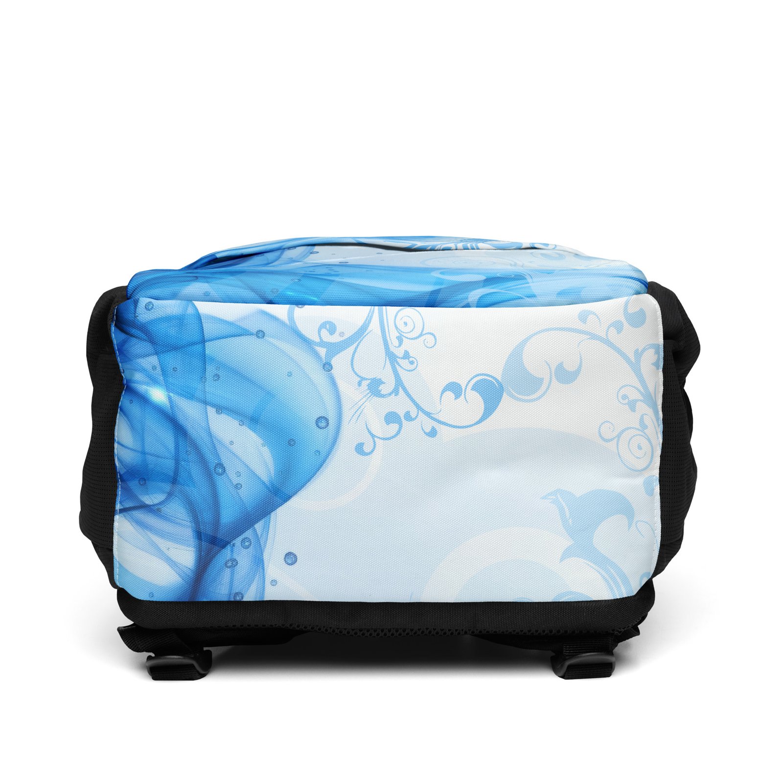 Make a statement with this unique blue backpack designed in a modern abstract feminine style. Inspired by the nostalgic Frutiger Aero aesthetic and vector garden elements, this bag blends soft curves, organic shapes, and vibrant tones into a fresh Y2K-inspired look.